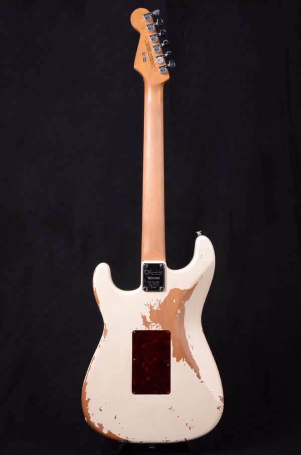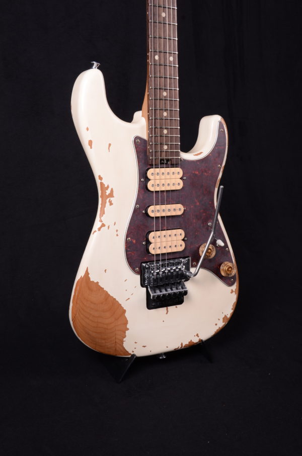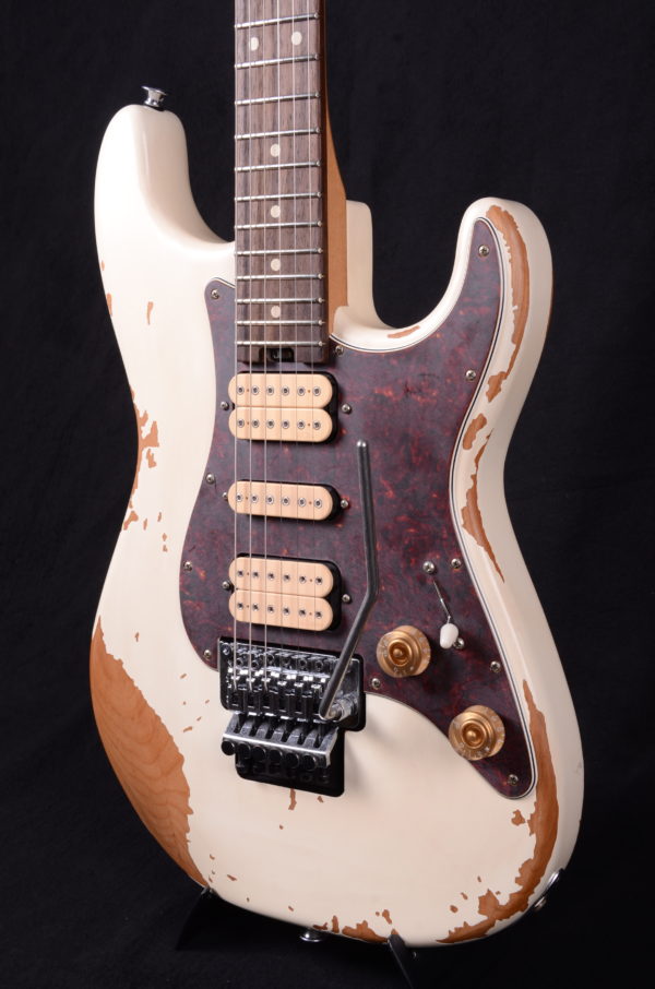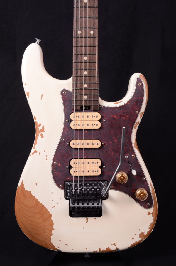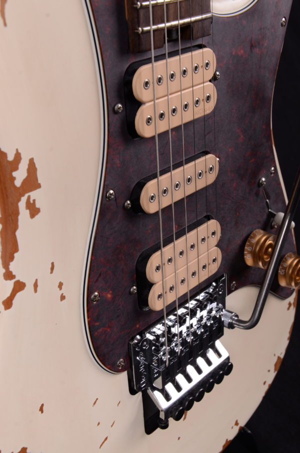 Crafted from alder, the distressed white body shows plenty of character with scrapes, dings, and worn finish that let you know this axe has been around the block a few times. The bolt-on maple neck featuring a pair of graphite reinforcement rods resists bending and warping from the rigors of the road. The smooth, fast speed neck profile allows for lightning fast playing while the comfortably rolled fingerboard edges give that broken-in feel of a well-loved instrument. Perfect for shredding, the 12″-16” compound radius rosewood fingerboard hosts 22 jumbo frets and aged white dot inlays. The heel-mount truss rod adjust thumbwheel makes on-the-fly neck relief tweaks a breeze.