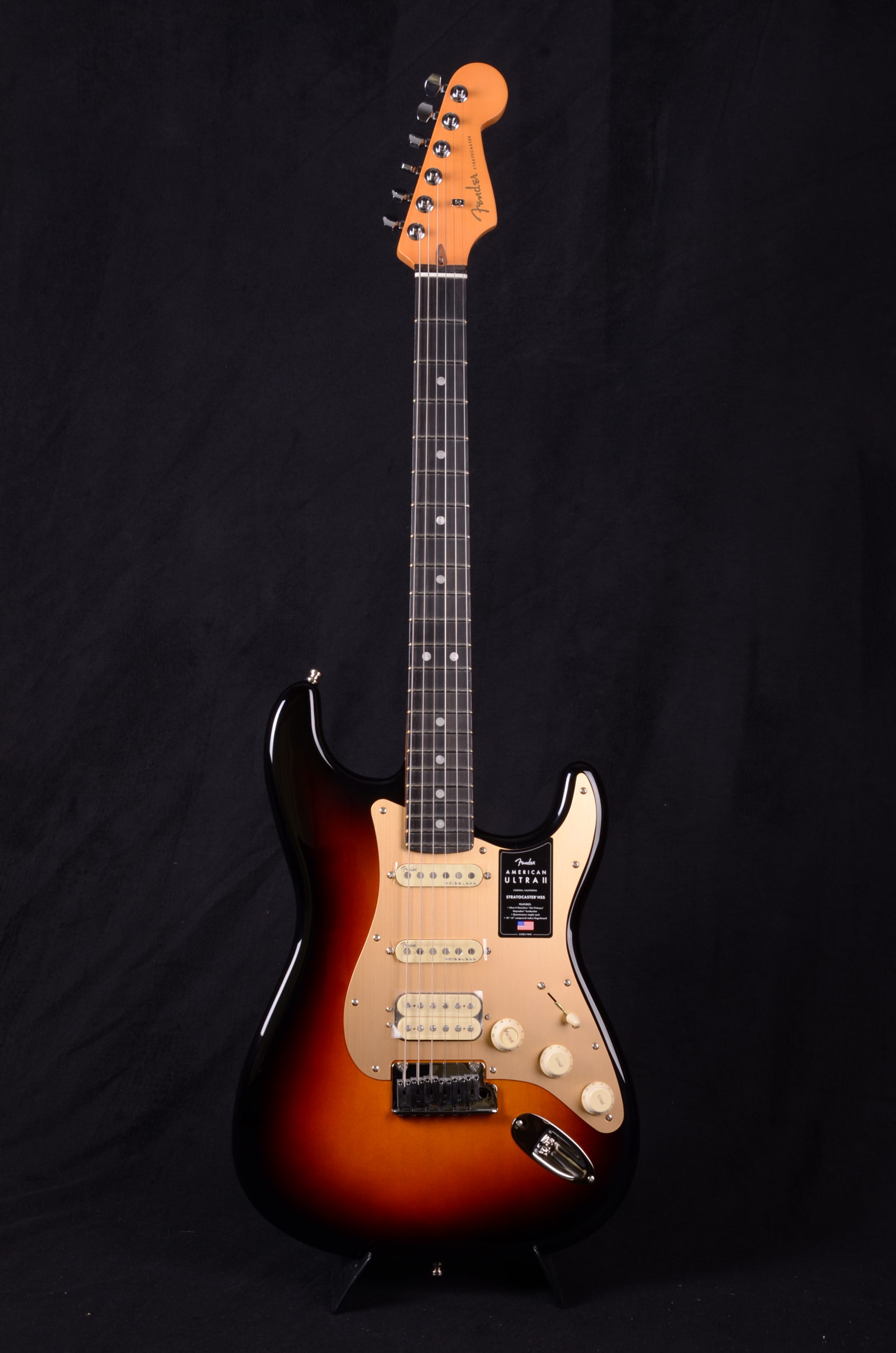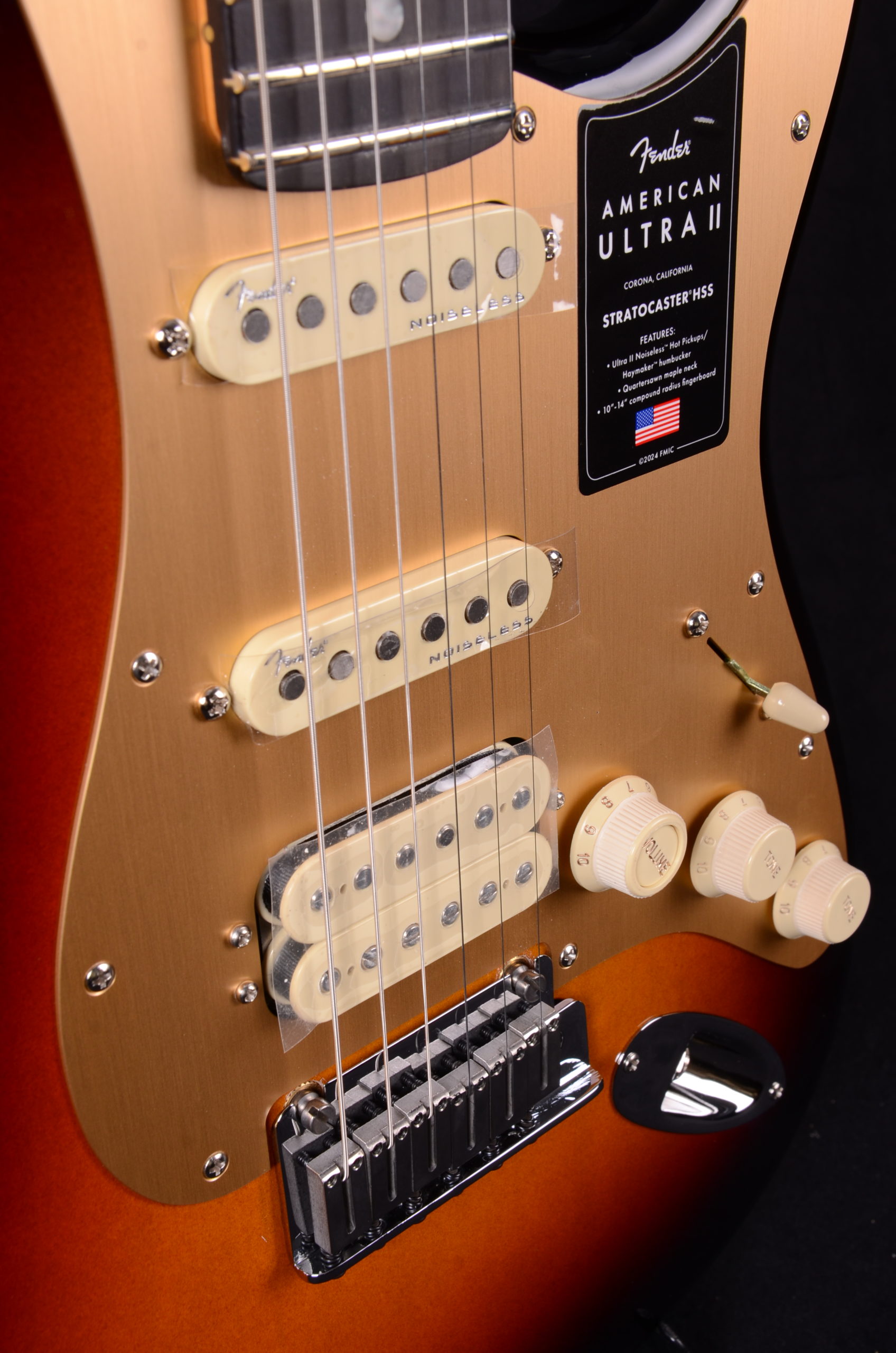 The Fender® American Ultra II Stratocaster® HSS features a select alder body with sculpted body contours. For effortless playability, the quartersawn maple neck features our Modern D profile and smooth Ultra Satin finish. Ebony or quartersawn maple 10”-14” compound radius fingerboards feature Ultra rolled edges, medium-jumbo frets, Luminlay® side dots and Graph Tech® TUSQ® nuts. The tapered neck heel and sculpted body contours allow unparalleled access to the higher register.