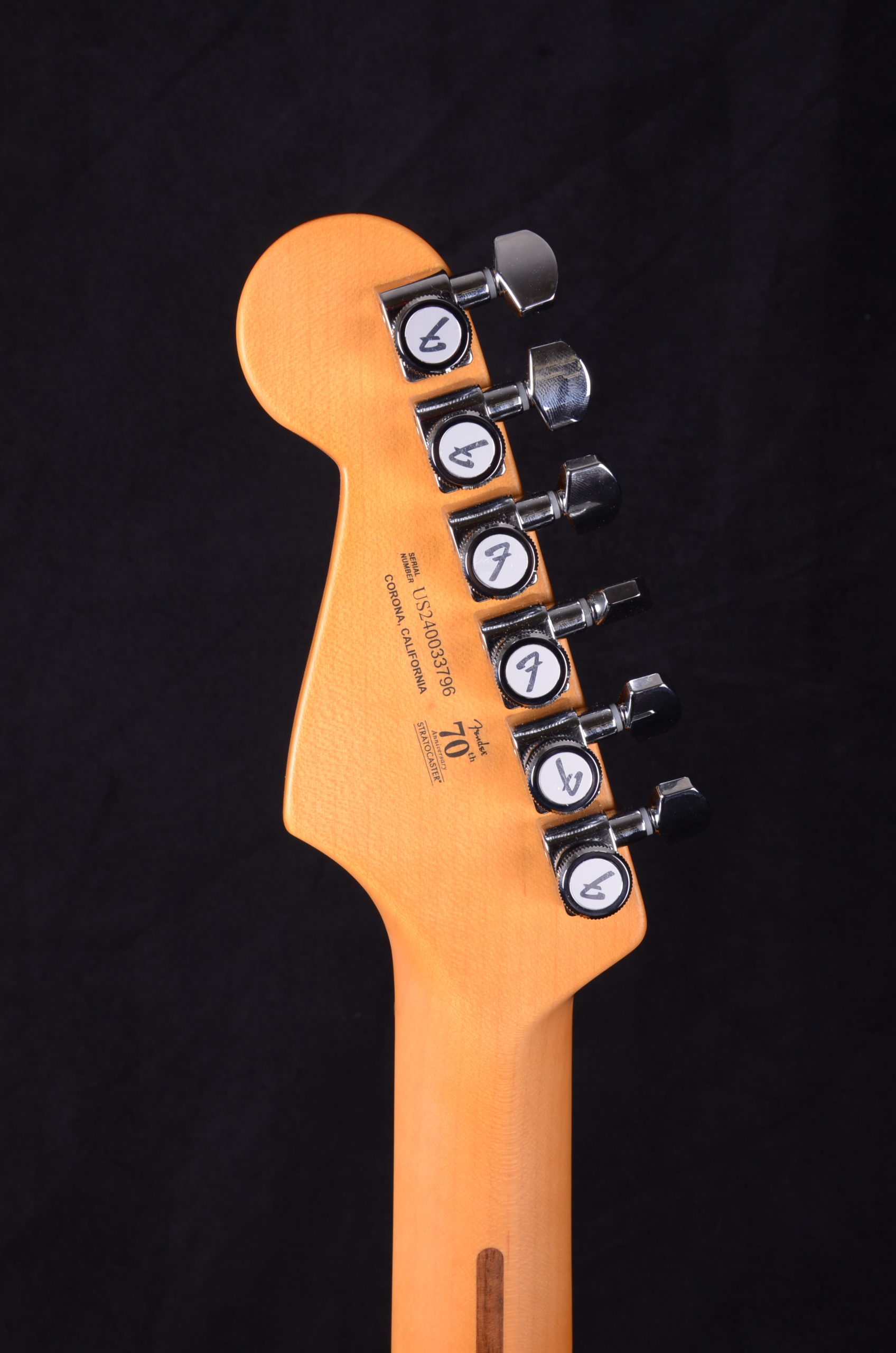 Under the hood, a pair of Ultra II Noiseless™ Hot Strat® pickups paired with a Haymaker™ Humbucker deliver everything from sweet crystalline cleans to searing leads, all without a hint of hum. Our patented S-1™ switch cleverly splits the Haymaker for even more tonal variety. Additional road-ready features include 2-Point American Ultra synchronized tremolo with pop-in arm, polished stainless steel block saddles, cold rolled steel block, deluxe locking tuners, soft-touch knobs and 1-ply anodized aluminum pickguard.