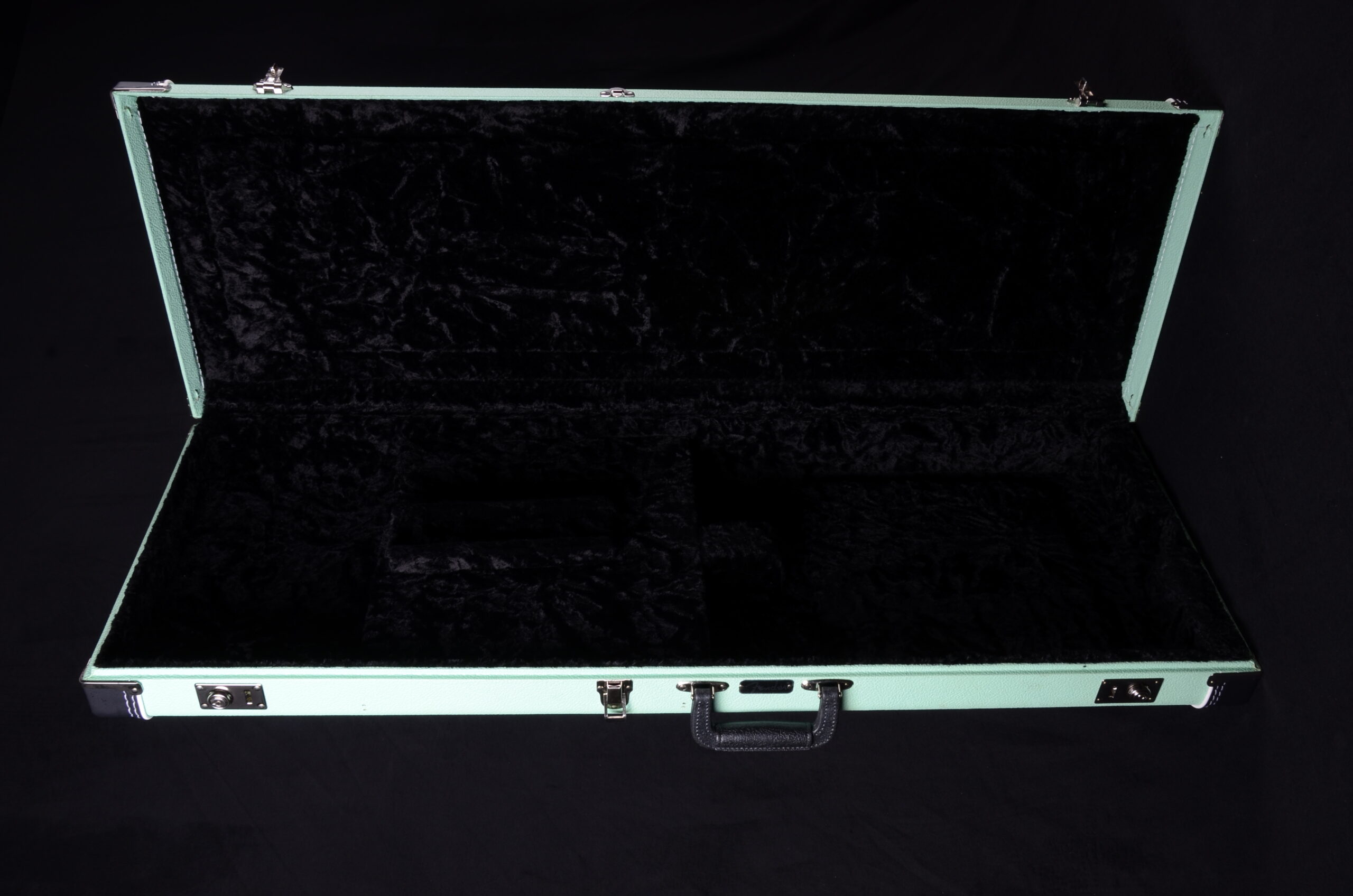 Built in Fender’s Ensenada factory, these are a faithful recreation of the cases that have been shipping with our vintage instruments since the early 1950’s. This limited edition case comes in a visually stunning Surf Green exterior with black plush interior. Made by hand with high quality materials, these cases will protect your investment with old school construction techniques and style. Featuring vegan leather end caps and a plastic handle for added protection and ease of portability. A cleverly engineered, spacious center pocket storage compartment to house all your accessories, while a padded plush interior lining keeps your guitar scratch and damage-free.