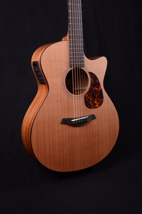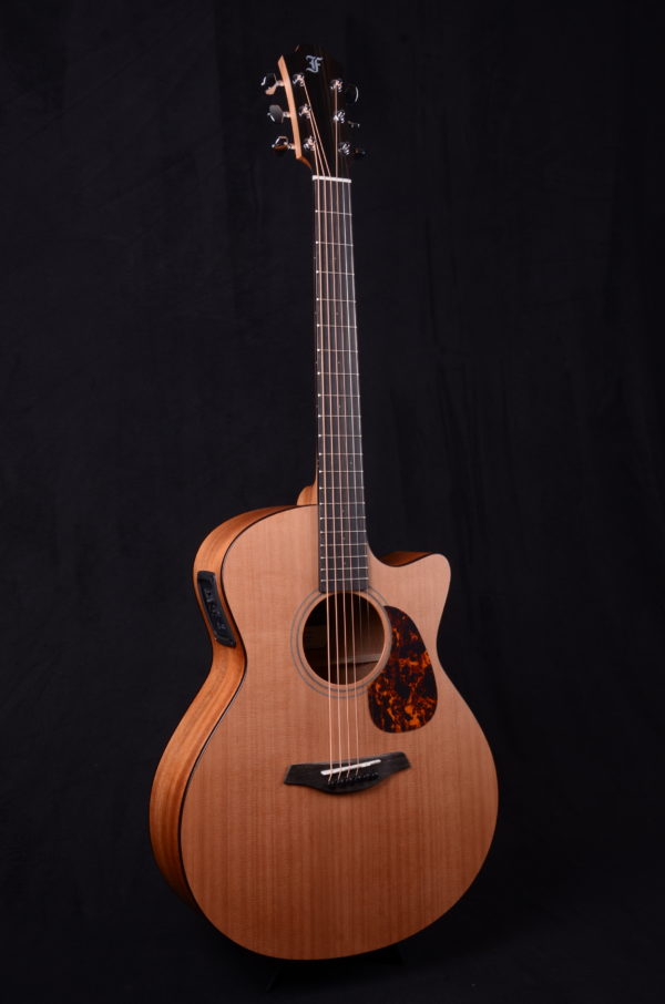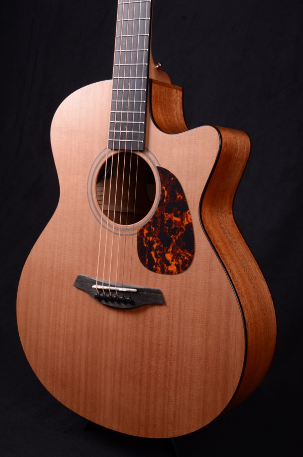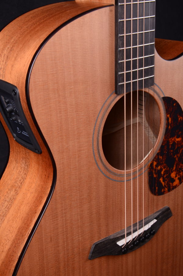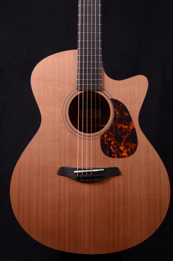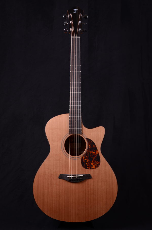 The Blue Master’s Choice is a high-quality all-solid-woods guitar in the Grand Auditorium shape with cutaway. The guitar features a Western red cedar soundboard, and the back and sides are made from carefully selected African mahogany. Appointments include a walnut double ring rosette, and faux tortoise pickguard and body binding. This tonewood combination and the Furch Open-Pore Finish lend the instrument a beautiful natural appearance and a warm musical sound that is balanced across the entire tonal spectrum with slightly emphasized lows.