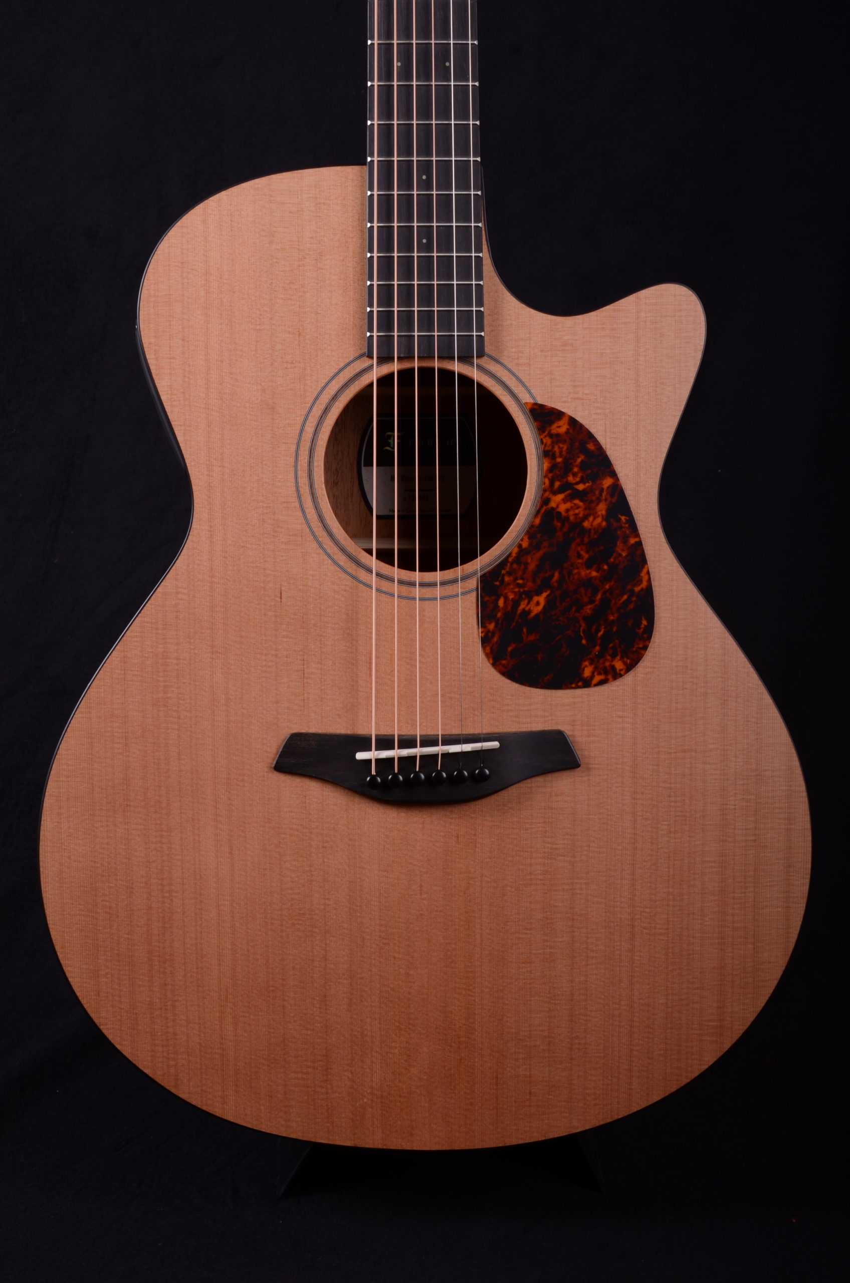 The Blue Master’s Choice is a high-quality all-solid-woods guitar in the Grand Auditorium shape with cutaway. The guitar features a Western red cedar soundboard, and the back and sides are made from carefully selected African mahogany. Appointments include a walnut double ring rosette, and faux tortoise pickguard and body binding. This tonewood combination and the Furch Open-Pore Finish lend the instrument a beautiful natural appearance and a warm musical sound that is balanced across the entire tonal spectrum with slightly emphasized lows.